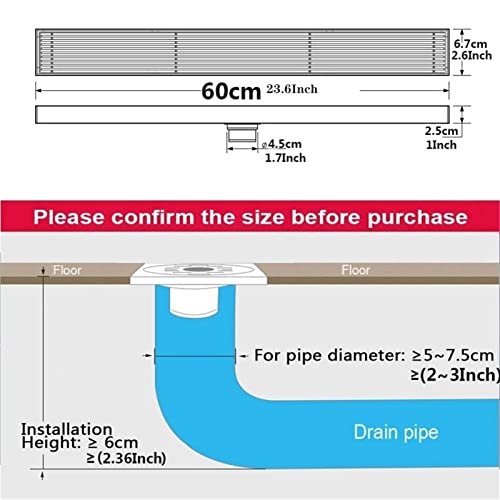 Dimensioni dello scarico lineare della doccia: la dimensione dello scarico lineare è di 60 cm di lunghezza e 6,7 cm di larghezza. Uscita centrale da 4,5 cm;