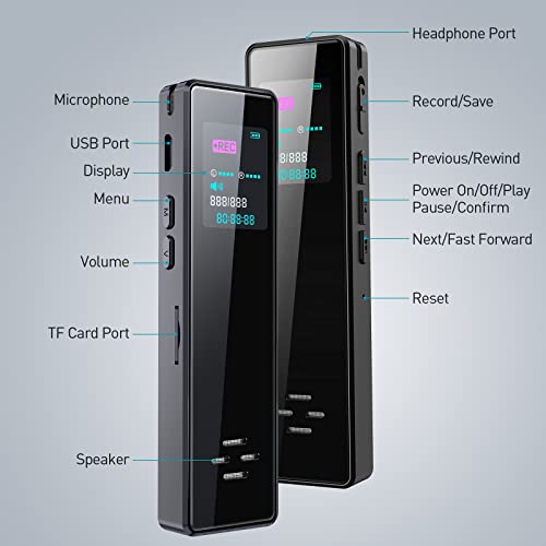 【DSP Digital Noise Reduction & Hi-Fi Recording Quality】 Adottando la più recente tecnologia DSP - Digital Intelligent Noise Reduction, il microfono a condensatore di grande calibro ad alta sensibilità e il chip di decodifica della sorgente audio Hi-Fi aggiornato per ripristinare il suono originale per voi. Il nostro registratore vocale è dotato di altoparlanti stereo Hi-Fi integrati di alta qualità e consente di ottenere una registrazione ultra chiara senza utilizzare le cuffie.