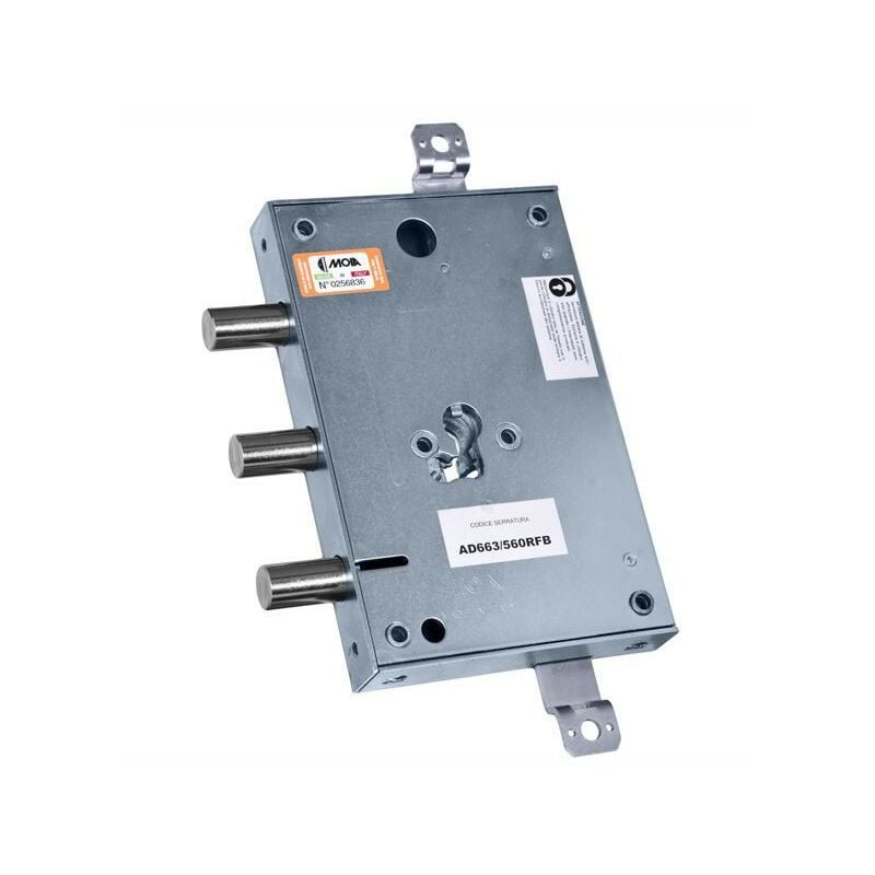 Serratura cilindro europeo a planare Movimento ad ingranaggi Trappola anti effrazione - Fori protettore mm 38 2 chiusure verticali Catenacci laterali 3 pistoni Interasse catenacci mm 56 Scatola mm 135x206x30 - Entrata mm 63 Cilindro non incluso