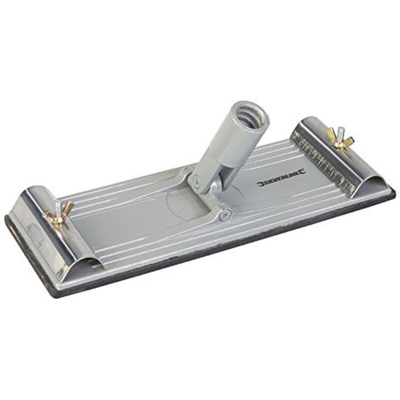 Levigatrice in alluminio pressofuso con 2 fascette di fissaggio per consentire il fissaggio di reti abrasive o carta abrasiva su un tampone in gommapiuma. La presa girevole accetta pali di estensione.
