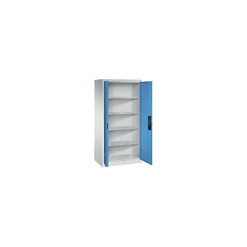 Armadio da officina per carichi pesanti, larghezza 930 mm, profondità 600 mm, anta blu chiaro. Fornitura = montato. Altezza = 1950 mm. Larghezza = 930 mm. Profondità = 600 mm. Larghezza interna = 928 mm. Altezza interna = 1840 mm. Profondità interna = 553 mm. Altezza zoccolo = 100 mm. Struttura = con saldatura. Portata struttura = 700 kg. Materiale corpo = acciaio. Materiale porta = acciaio. Superficie = con verniciatura a forno. Materiale ripiani = acciaio, zincato. Colore corpo = grigio chiaro RAL 7035. Colore porta = blu chiaro RAL 5012. Portata per ripiano = 110 kg. Numero ripiani = 4 pz. Passo di regolazione altezza ripiani = 15 mm. Tipo di porta = anta a battente. Angolo di apertura delle porte = 180 °. La larghezza standard per impieghi universali in officina, magazzino e fabbrica. Portata elevata di ogni ripiano zincato: 110 kg. Portata struttura 700 kg. Angolo di apertura ante circa 180°. Serratura brevettata Ergo-Lock 4.0 di facile uso, con 2 chiavi. Ripiani zincati