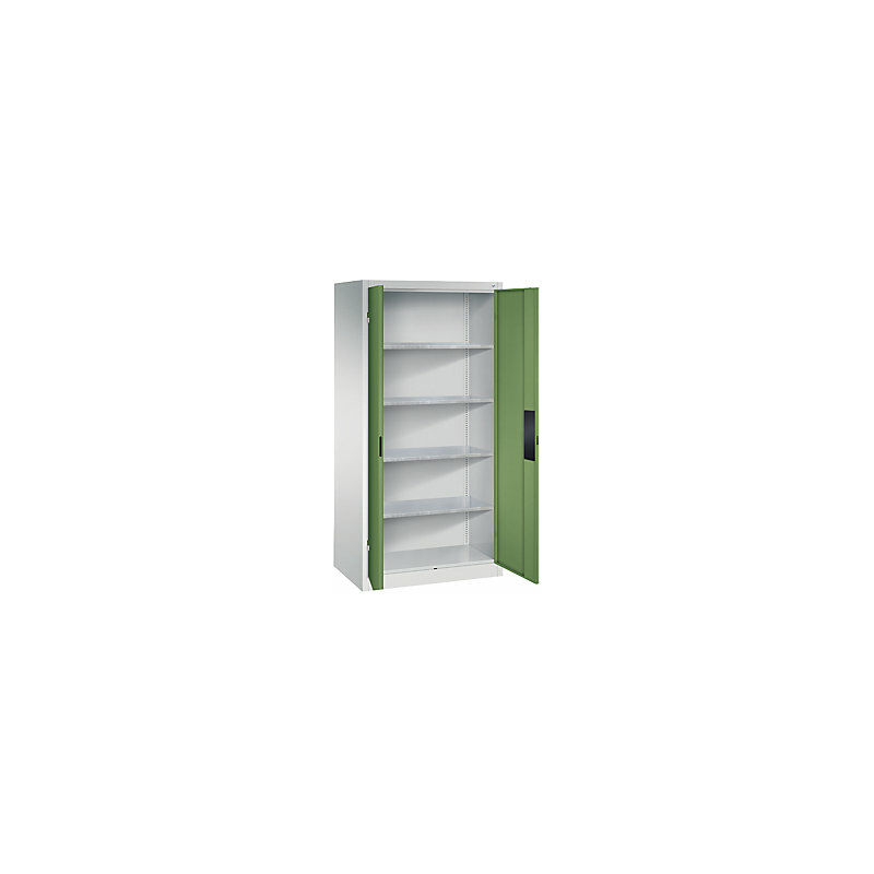 Armadio da officina per carichi pesanti, larghezza 930 mm, profondità 600 mm, anta verde reseda. Fornitura = montato. Altezza = 1950 mm. Larghezza = 930 mm. Profondità = 600 mm. Larghezza interna = 928 mm. Altezza interna = 1840 mm. Profondità interna = 553 mm. Altezza zoccolo = 100 mm. Struttura = con saldatura. Portata struttura = 700 kg. Materiale corpo = acciaio. Materiale porta = acciaio. Superficie = con verniciatura a forno. Materiale ripiani = acciaio, zincato. Colore corpo = grigio chiaro RAL 7035. Colore porta = verde reseda RAL 6011. Portata per ripiano = 110 kg. Numero ripiani = 4 pz. Passo di regolazione altezza ripiani = 15 mm. Tipo di porta = anta a battente. Angolo di apertura delle porte = 180 °. La larghezza standard per impieghi universali in officina, magazzino e fabbrica. Portata elevata di ogni ripiano zincato: 110 kg. Portata struttura 700 kg. Angolo di apertura ante circa 180°. Serratura brevettata Ergo-Lock 4.0 di facile uso, con 2 chiavi. Ripiani zincati