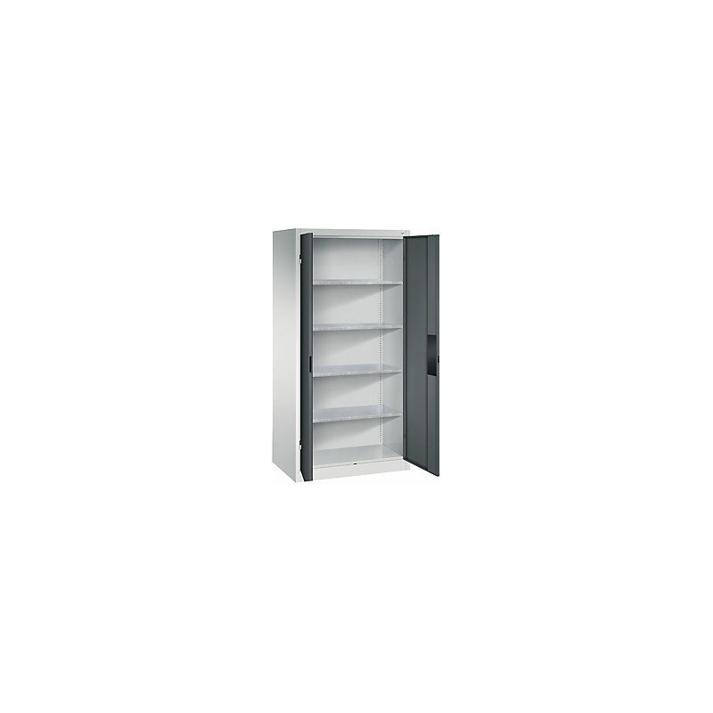 Armadio da officina per carichi pesanti, larghezza 930 mm, profondità 600 mm, anta antracite. Fornitura = montato. Altezza = 1950 mm. Larghezza = 930 mm. Profondità = 600 mm. Larghezza interna = 928 mm. Altezza interna = 1840 mm. Profondità interna = 553 mm. Altezza zoccolo = 100 mm. Struttura = con saldatura. Portata struttura = 700 kg. Materiale corpo = acciaio. Materiale porta = acciaio. Superficie = con verniciatura a forno. Materiale ripiani = acciaio, zincato. Colore corpo = grigio chiaro RAL 7035. Colore porta = grigio antracite RAL 7016. Portata per ripiano = 110 kg. Numero ripiani = 4 pz. Passo di regolazione altezza ripiani = 15 mm. Tipo di porta = anta a battente. Angolo di apertura delle porte = 180 °. La larghezza standard per impieghi universali in officina, magazzino e fabbrica. Portata elevata di ogni ripiano zincato: 110 kg. Portata struttura 700 kg. Angolo di apertura ante circa 180°. Serratura brevettata Ergo-Lock 4.0 di facile uso, con 2 chiavi. Ripiani zincati