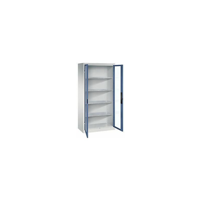 Armadio con ante a battente con finestrella, alt. x largh. x prof. 1950 x 930 x 500 mm, 4 ripiani, grigio chiaro / indaco. Fornitura = montato. Altezza = 1950 mm. Larghezza = 930 mm. Profondità = 500 mm. Larghezza interna = 928 mm. Altezza interna = 1840 mm. Profondità interna = 453 mm. Altezza zoccolo = 100 mm. Struttura = con saldatura. Dotazione interna = 4 ripiani. Portata struttura = 450 kg. Materiale corpo = acciaio. Materiale porta = vetro acrilico, acciaio. Superficie = con verniciatura a forno. Materiale ripiani = lamiera d'acciaio, zincata. Colore corpo = grigio chiaro RAL 7035. Colore porta = indaco RAL 5023. Portata per ripiano = 70 kg. Colore ripiani = argento. Numero ripiani = 4 pz. Larghezza ripiani = 925 mm. Profondità ripiani = 452 mm. Passo di regolazione altezza ripiani = 15 mm. Tipo di porta = ante a battente con finestrella. Versione porta = con finestrella. Angolo di apertura delle porte = 110 °. Armadi per officina con finestrelle per aumentare l'ordine e ridurre
