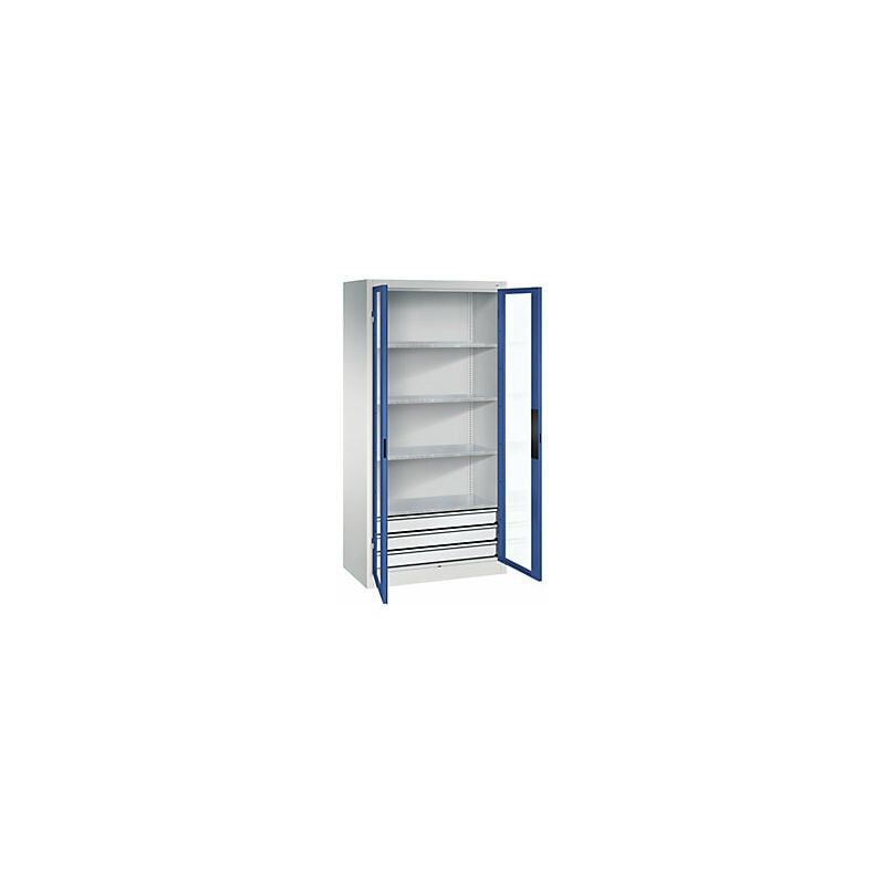 Armadio con ante a battente con finestrella, alt. x largh. x prof. 1950 x 930 x 500 mm, 4 ripiani, 3 cassetti, grigio chiaro / blu genziana. Fornitura = montato. Altezza = 1950 mm. Larghezza = 930 mm. Profondità = 500 mm. Larghezza interna = 928 mm. Altezza interna = 1840 mm. Profondità interna = 453 mm. Altezza zoccolo = 100 mm. Struttura = con saldatura. Dotazione interna = 4 ripiani, 3 cassetti. Portata struttura = 450 kg. Materiale corpo = acciaio. Materiale porta = vetro acrilico, acciaio. Superficie = con verniciatura a forno. Materiale ripiani = lamiera d'acciaio, zincata. Colore corpo = grigio chiaro RAL 7035. Colore porta = blu genziana RAL 5010. Portata per ripiano = 70 kg. Colore ripiani = argento. Numero ripiani = 4 pz. Larghezza ripiani = 925 mm. Profondità ripiani = 452 mm. Passo di regolazione altezza ripiani = 15 mm. Tipo di porta = ante a battente con finestrella. Versione porta = con finestrella. Angolo di apertura delle porte = 110 °. Armadi per officina con