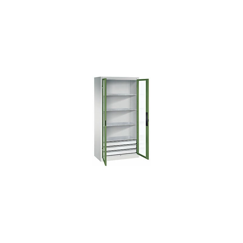 Armadio con ante a battente con finestrella, alt. x largh. x prof. 1950 x 930 x 500 mm, 4 ripiani, 3 cassetti, grigio chiaro / verde reseda. Fornitura = montato. Altezza = 1950 mm. Larghezza = 930 mm. Profondità = 500 mm. Larghezza interna = 928 mm. Altezza interna = 1840 mm. Profondità interna = 453 mm. Altezza zoccolo = 100 mm. Struttura = con saldatura. Dotazione interna = 4 ripiani, 3 cassetti. Portata struttura = 450 kg. Materiale corpo = acciaio. Materiale porta = vetro acrilico, acciaio. Superficie = con verniciatura a forno. Materiale ripiani = lamiera d'acciaio, zincata. Colore corpo = grigio chiaro RAL 7035. Colore porta = verde reseda RAL 6011. Portata per ripiano = 70 kg. Colore ripiani = argento. Numero ripiani = 4 pz. Larghezza ripiani = 925 mm. Profondità ripiani = 452 mm. Passo di regolazione altezza ripiani = 15 mm. Tipo di porta = ante a battente con finestrella. Versione porta = con finestrella. Angolo di apertura delle porte = 110 °. Armadi per officina con