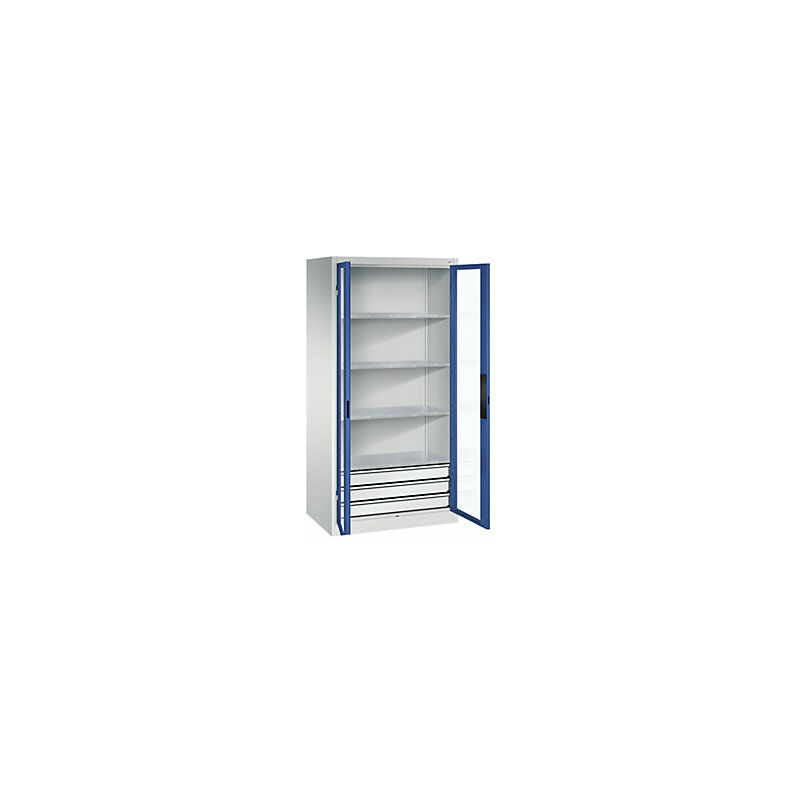 Armadio con ante a battente con finestrella, alt. x largh. x prof. 1950 x 930 x 600 mm, 4 ripiani, 3 cassetti, grigio chiaro / blu genziana. Fornitura = montato. Altezza = 1950 mm. Larghezza = 930 mm. Profondità = 600 mm. Larghezza interna = 928 mm. Altezza interna = 1840 mm. Profondità interna = 553 mm. Altezza zoccolo = 100 mm. Struttura = con saldatura. Dotazione interna = 4 ripiani, 3 cassetti. Portata struttura = 450 kg. Materiale corpo = acciaio. Materiale porta = vetro acrilico, acciaio. Superficie = con verniciatura a forno. Materiale ripiani = lamiera d'acciaio, zincata. Colore corpo = grigio chiaro RAL 7035. Colore porta = blu genziana RAL 5010. Portata per ripiano = 70 kg. Colore ripiani = argento. Numero ripiani = 4 pz. Larghezza ripiani = 925 mm. Profondità ripiani = 552 mm. Passo di regolazione altezza ripiani = 15 mm. Tipo di porta = ante a battente con finestrella. Versione porta = con finestrella. Angolo di apertura delle porte = 110 °. Armadi per officina con