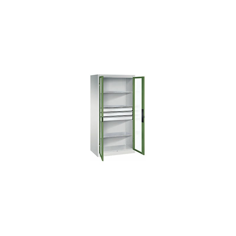 Armadio con ante a battente con finestrella, alt. x largh. x prof. 1950 x 930 x 600 mm, 3 ripiani, 3 cassetti, grigio chiaro / verde reseda. Fornitura = montato. Altezza = 1950 mm. Larghezza = 930 mm. Profondità = 600 mm. Larghezza interna = 928 mm. Altezza interna = 1840 mm. Profondità interna = 553 mm. Altezza zoccolo = 100 mm. Struttura = con saldatura. Dotazione interna = 3 ripiani, 3 cassetti. Portata struttura = 450 kg. Materiale corpo = acciaio. Materiale porta = vetro acrilico, acciaio. Superficie = con verniciatura a forno. Materiale ripiani = lamiera d'acciaio, zincata. Colore corpo = grigio chiaro RAL 7035. Colore porta = verde reseda RAL 6011. Portata per ripiano = 70 kg. Colore ripiani = argento. Numero ripiani = 3 pz. Larghezza ripiani = 925 mm. Profondità ripiani = 552 mm. Passo di regolazione altezza ripiani = 15 mm. Tipo di porta = ante a battente con finestrella. Versione porta = con finestrella. Angolo di apertura delle porte = 110 °. Armadi per officina con