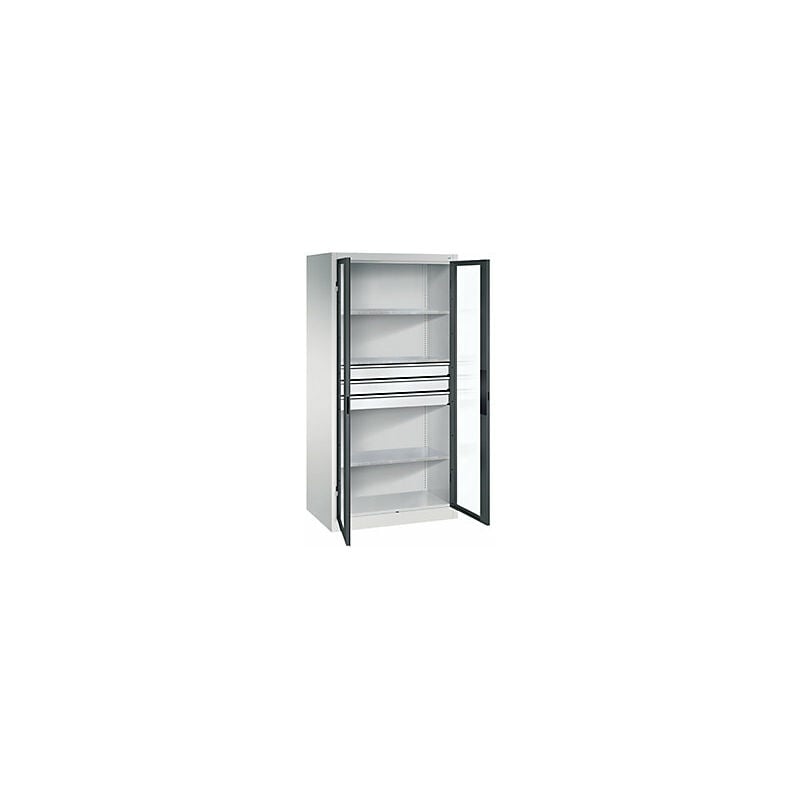 Armadio con ante a battente con finestrella, alt. x largh. x prof. 1950 x 930 x 600 mm, 3 ripiani, 3 cassetti, grigio chiaro / grigio antracite. Fornitura = montato. Altezza = 1950 mm. Larghezza = 930 mm. Profondità = 600 mm. Larghezza interna = 928 mm. Altezza interna = 1840 mm. Profondità interna = 553 mm. Altezza zoccolo = 100 mm. Struttura = con saldatura. Dotazione interna = 3 ripiani, 3 cassetti. Portata struttura = 450 kg. Materiale corpo = acciaio. Materiale porta = vetro acrilico, acciaio. Superficie = con verniciatura a forno. Materiale ripiani = lamiera d'acciaio, zincata. Colore corpo = grigio chiaro RAL 7035. Colore porta = grigio antracite RAL 7016. Portata per ripiano = 70 kg. Colore ripiani = argento. Numero ripiani = 3 pz. Larghezza ripiani = 925 mm. Profondità ripiani = 552 mm. Passo di regolazione altezza ripiani = 15 mm. Tipo di porta = ante a battente con finestrella. Versione porta = con finestrella. Angolo di apertura delle porte = 110 °. Armadi per officina con