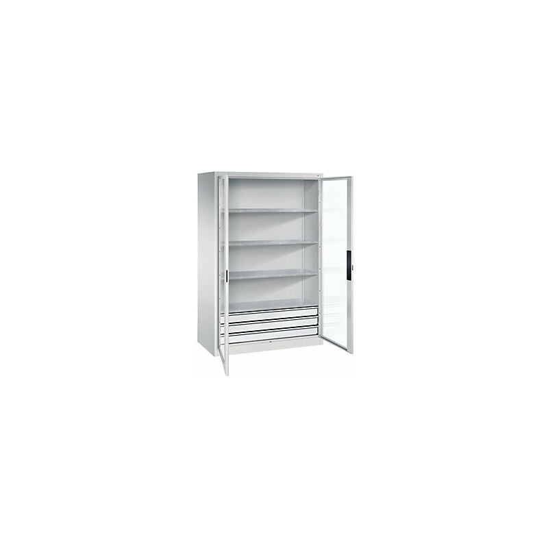 Armadio con ante a battente con finestrella, alt. x largh. x prof. 1950 x 1200 x 600 mm, 4 ripiani, 3 cassetti, grigio chiaro / grigio chiaro. Fornitura = montato. Altezza = 1950 mm. Larghezza = 1200 mm. Profondità = 600 mm. Larghezza interna = 1198 mm. Altezza interna = 1840 mm. Profondità interna = 553 mm. Altezza zoccolo = 100 mm. Struttura = con saldatura. Dotazione interna = 4 ripiani, 3 cassetti. Portata struttura = 450 kg. Materiale corpo = acciaio. Materiale porta = vetro acrilico, acciaio. Superficie = con verniciatura a forno. Materiale ripiani = lamiera d'acciaio, zincata. Colore corpo = grigio chiaro RAL 7035. Colore porta = grigio chiaro RAL 7035. Portata per ripiano = 70 kg. Colore ripiani = argento. Numero ripiani = 4 pz. Larghezza ripiani = 1195 mm. Profondità ripiani = 552 mm. Passo di regolazione altezza ripiani = 15 mm. Tipo di porta = ante a battente con finestrella. Versione porta = con finestrella. Angolo di apertura delle porte = 110 °. Armadi per officina con