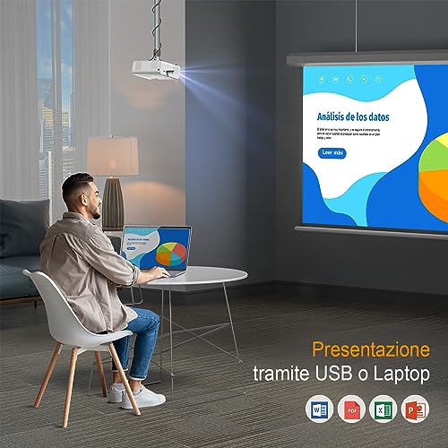【Connessione Multi-dispositivo】 Il video proiettore portatile è dotato di porte HDMI, AV e doppie porte USB. Puoi collegare TV box, unità USB, PS5, Android/IOS e altri dispositivi. Il proiettore domestico può riprodurre PPT, EXCEL e WORD da una chiavetta USB o da un laptop in un ambiente leggermente buio. Suggerimento: Netflix, Prime Video, H