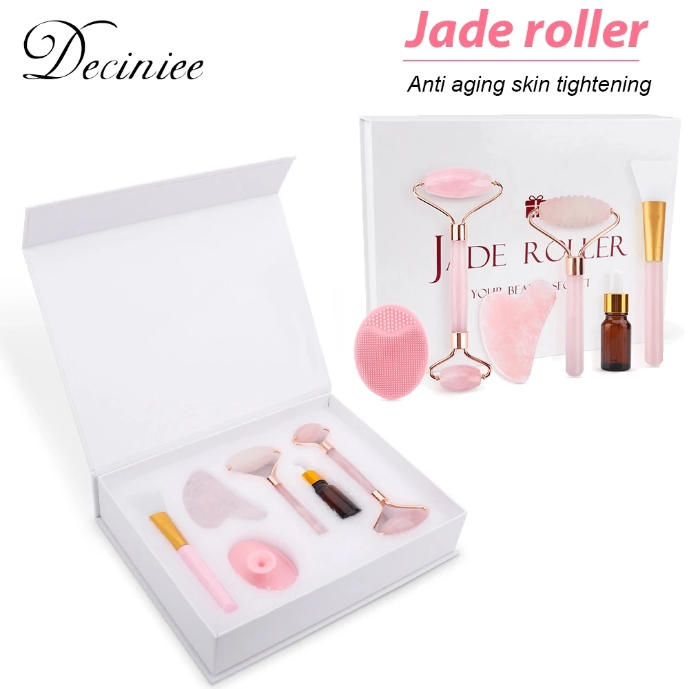 6PCS/Set Rose Jade Roller Gua Sha Set Face Brush Natural Quartz Scraper Jade Stone Massage Facial Massager Tool for Body Neck