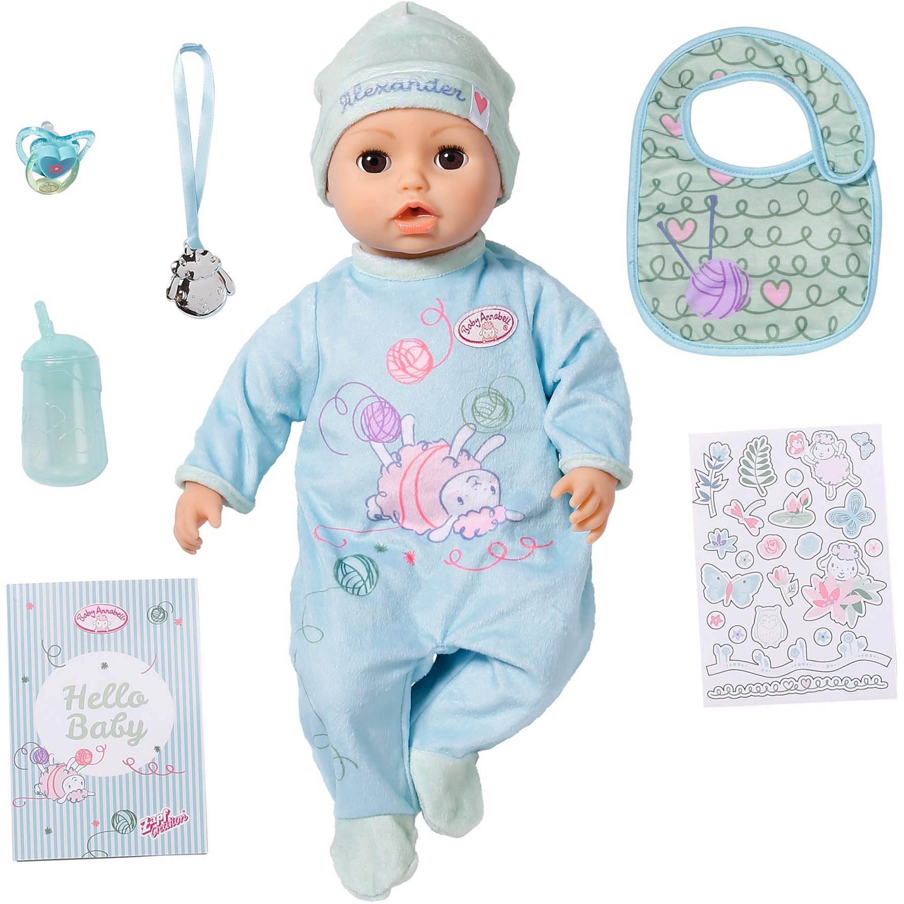 Se Alexander ha la sua voglia di muoversi, puoi confonderti mentre cambi i pannolini. Poi si sdraia sul fasciatoio e ridacchia entusiasta quando mamma o papà muovono le sue membra. Braccia sopra la testa, gambe alla parte superiore del corpo, pianta del piede alla pianta del piede, piedi che afferrano la mano. Sembra simile alla pecora sul suo romper blu. A volte, tuttavia, le cose devono essere fatte in fretta: allora Alexander può diventare un po ''testardo. Ma non appena prende il ciuccio in bocca, tutto va di nuovo bene. Lo succhia con movimenti realistici della bocca e suoni dolci. Fa lo stesso con la sua bottiglia. Anche il ragazzo bambola con il corpo in tessuto morbido ama le coccole. Quando Alexander si addormenta, chiude i suoi occhi marroni addormentati, sbadiglia contento e si addormenta con suoni di respiro carini.