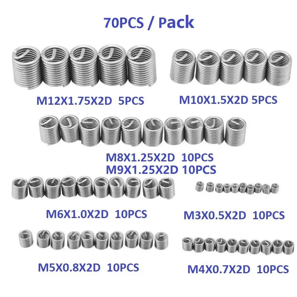 70pcs M3 M4 M5 M6 M8 M9 M10 M12 Wire Thread Insert Helicoil Stainless Steel Easy Install Repair Tool Wire Threaded Inserts Kits