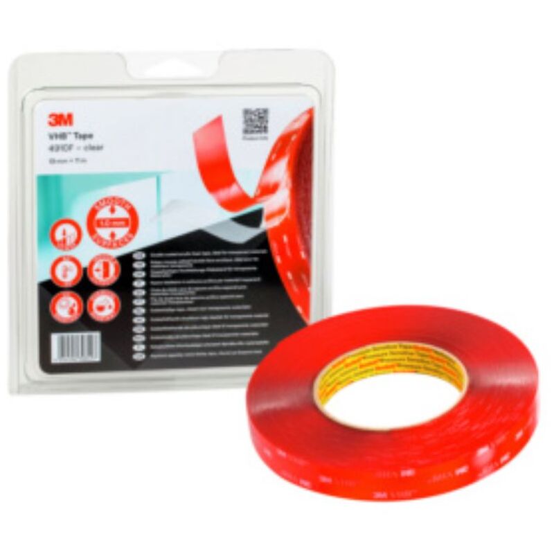 Nastro adesivo ad alta prestazione a doppio lato VHB VHB 4910F 19mm x 11m x 1mm ideale trasparente per composti trasparenti. Ideale per incollare materiali trasparenti • come assemblaggio di segni retroilluminati o traslucidi, vetro e materiali con alta energia superficiale (HSE) o adesivo a pannello e fissaggio di elementi di irrigidimento per materiali ad alta energia elevati solventi e resistenza alle intemperie su superfici ruvide e irregolari. È possibile collegare completamente la tensione, il fissaggio quasi invisibile garantisce superfici lisce ad alto assorbimento di carico dinamico ridotto vibrazioni e dossi crea una tenuta permanente contro l'acqua, l'umidità, ecc.