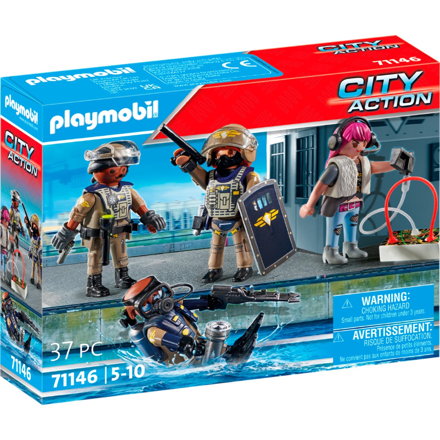 Con questo set di quattro figure PLAYMOBIL, è possibile creare una potente task force per la sicurezza in Playmobil City. Le tre task force SWAT sono dotate di un sacco di attrezzature, tra cui accessori subacquei e abbigliamento adatto. Stai inseguendo un cattivo che è incluso come quarta figura.
