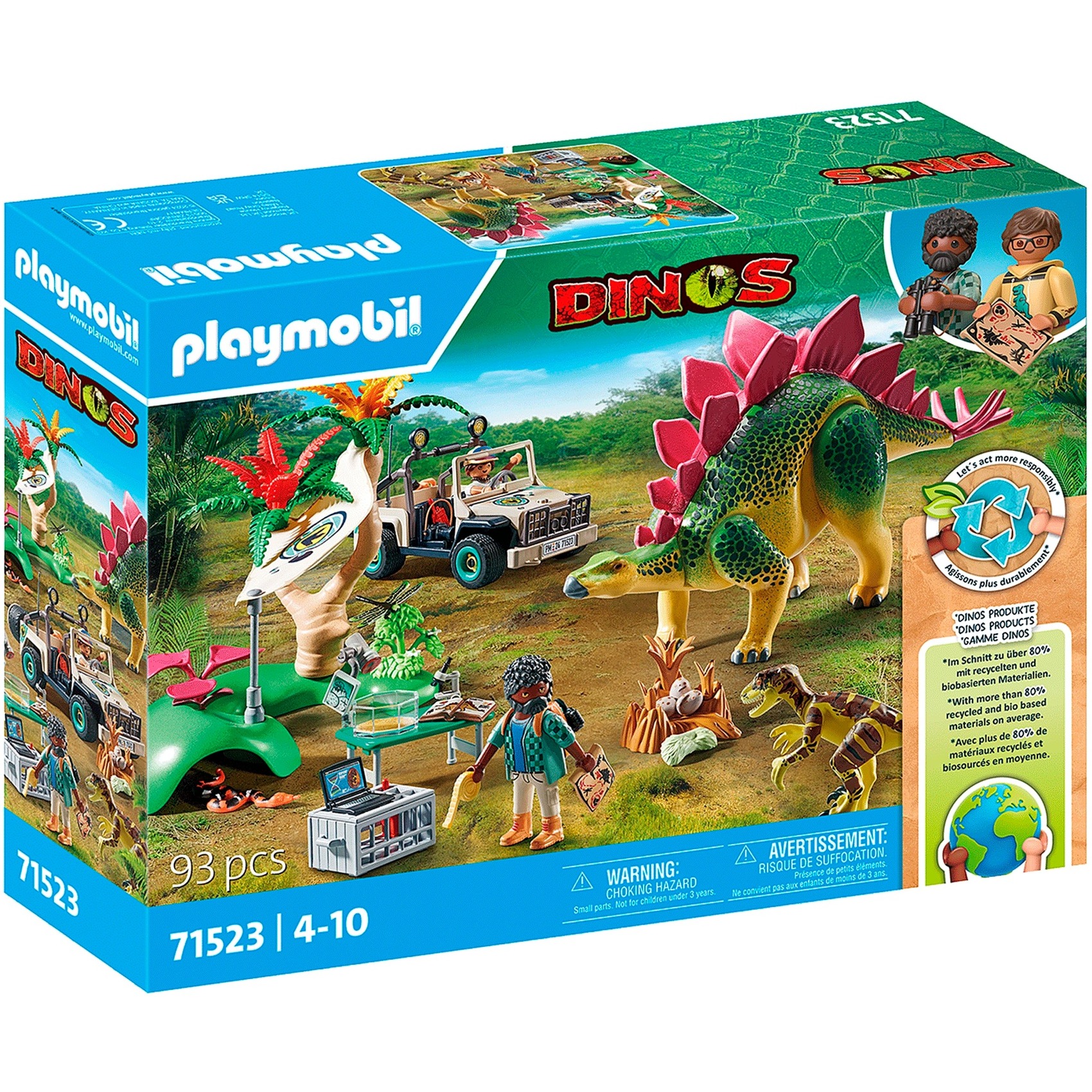 Scoperte entusiasmanti nel mondo di PLAYMOBIL Dinos! Questo mondo di dinosauri PLAYMOBIL offre ai bambini a partire dai 4 anni l''opportunità di immergersi nell''affascinante mondo delle lucertole giganti. Ogni set della serie contiene schede di conoscenza sui dinosauri che contiene. Questo set include uno Stegosauro e un Deinonychus. Entrambe le figure possono muovere braccia, gambe e testa. Due ricercatori di dinosauri lavorano nella giungla e raccolgono dati sui dinosauri: prendono le misure, esaminano le uova al microscopio e fanno un tour di scoperta in un fuoristrada. Un ottimo set per i fan dei dinosauri dai quattro anni in su!