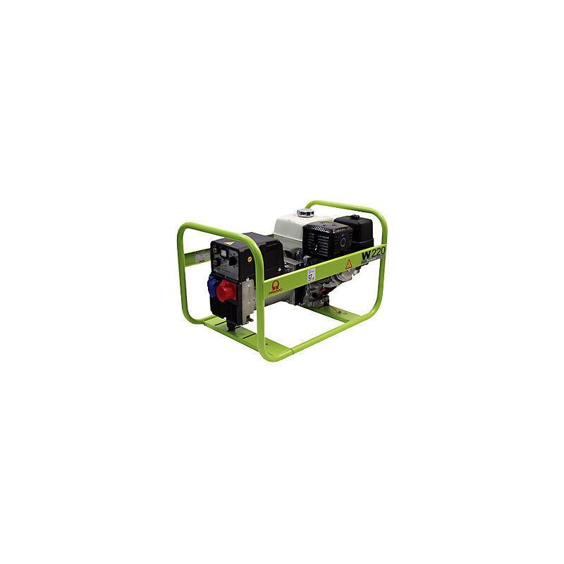 Generatore di corrente, benzina, 230/400 V, 2,1 / 4,5 kW. Fornitura = montato. Lunghezza = 875 mm. Larghezza = 620 mm. Altezza = 600 mm. Tipo di tensione = flusso luminoso e corrente trifase. Tensione = 230 / 400 V. Frequenza = 50 Hz. Cilindrata = 0.389 m³. Capacità serbatoio = 6.1 l. Livello di pressione acustica = 69 dB(A). Tipo di presa = 1 da 230 V Schuko, 1 da 230 V CEE 16 A, 1 da 230 V CEE 32 A. Tipo di motore = benzina. Potenza motore = 2.4 / 5.5 kW. Potenza nominale = 2.1 / 4.5 kW. Tempo di funzionamento con output al 50% = 2.8 ore. Tipo di prodotto = generatore elettrico. Versatile dispositivo combinato. Generatore di corrente con corrente trifase e alternata e dispositivo di saldatura (DC) fino a 220 A. Possibilità di utilizzare tutti i comuni elettrodi fino a 5 mm. Motore industriale Honda GX390. Questo generatore di corrente universale può essere utilizzato anche come dispositivo di saldatura. Le spine di collegamento per i cavi di saldatura sono incluse nella fornitura. I