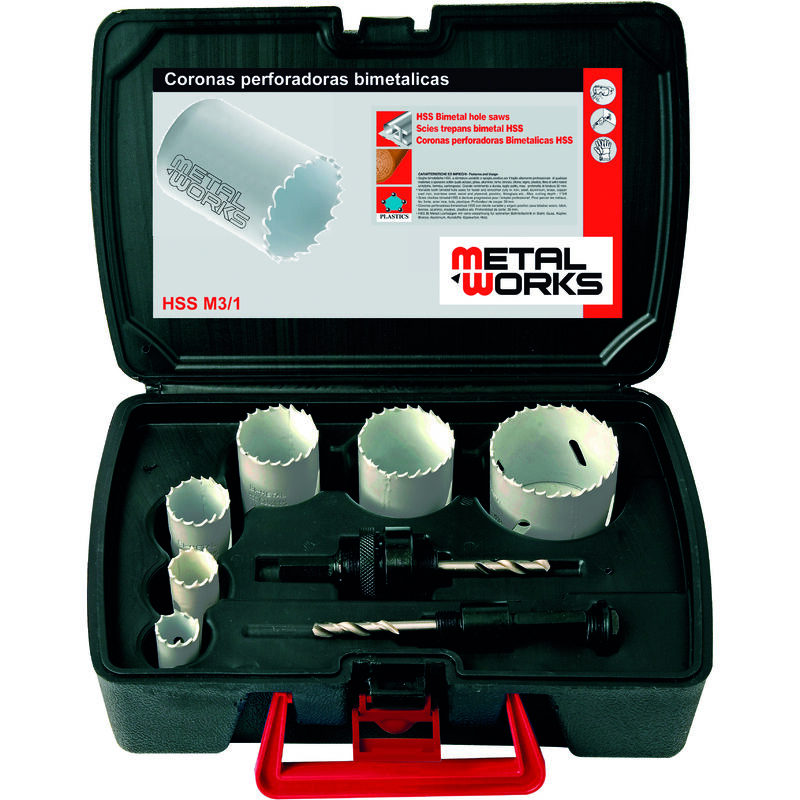 Contiene 6 corone (30 mm) Ø 22/29/35/44/51/64 mm + 2 frese di centraggio in una pratica valigetta.