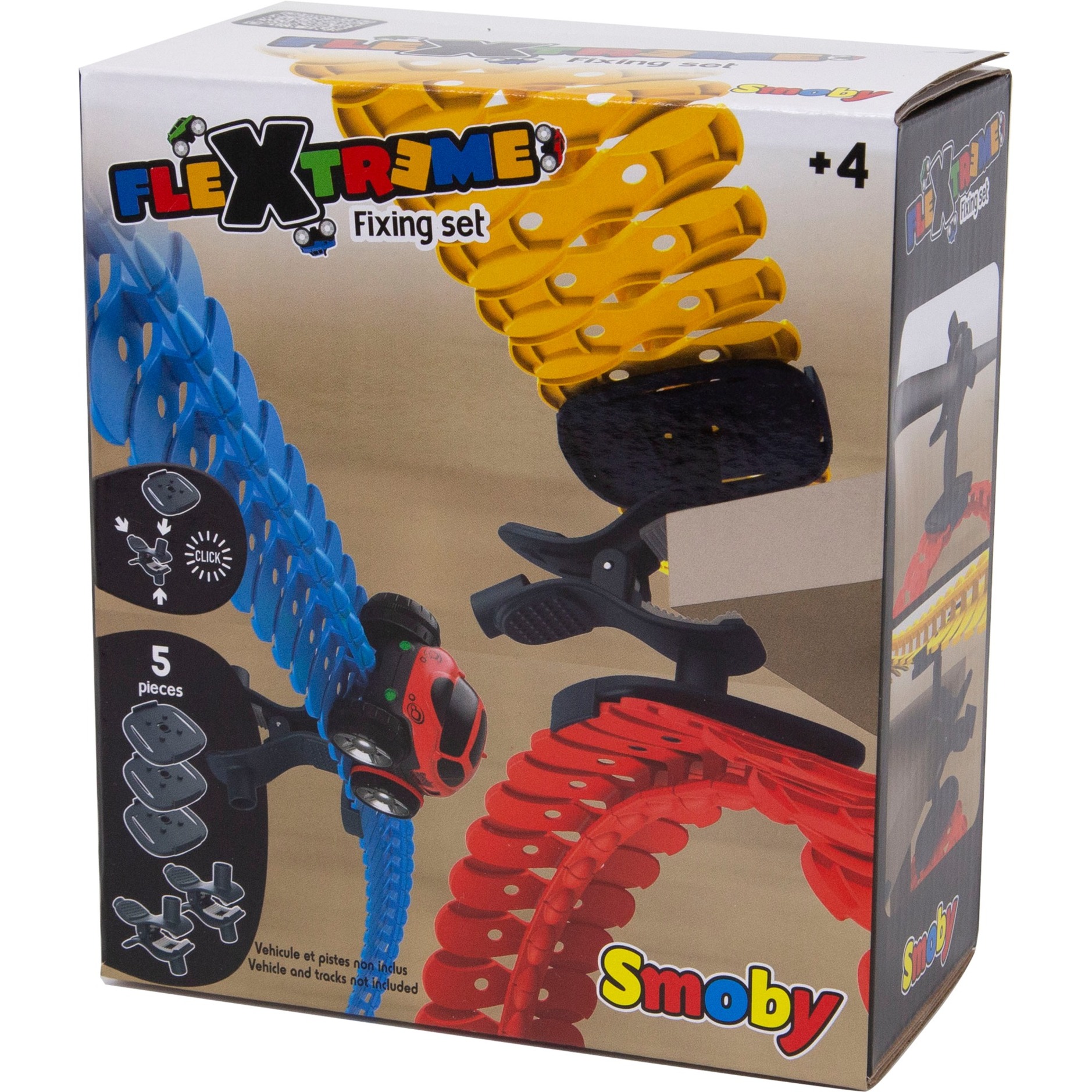 Smoby FleXtreme è un mondo di gioco completamente nuovo che non pone limiti alla creatività dei bambini! Utilizzando binari flessibili, i bambini possono assemblare le piste più folli e guidare incredibili acrobazie e piste con le potenti auto da corsa FleXtreme: tra cui pendenze sensazionali, corse in testa e pendenze pazzesche! Con il fantastico kit di montaggio FleXtreme Fixing Set, l''attuale pista FleXtreme può essere idealmente completata, perché i 2 morsetti di fissaggio multi-grip e 3 supporti per binari consentono un''architettura da pista ancora più insolita e semplificano i loop autocostruiti. I supporti della guida possono essere montati su uno dei tre punti di fissaggio dei morsetti di montaggio. Questi sostenitori danno ancora più controllo in curva e impediscono alle auto da corsa di essere sganciate a causa di curvature troppo ripide. Il sistema di fissaggio dei morsetti Multi-Grip è facile da capire anche dai bambini più piccoli e consente il fissaggio a una varietà di chicane: tavolo, tende, mensola o sedie, armadio, lenzuola, pali, tutto può essere installato in pista. I terminali possono essere collegati in diversi modi e possono ospitare fino a tre supporti ferroviari contemporaneamente.