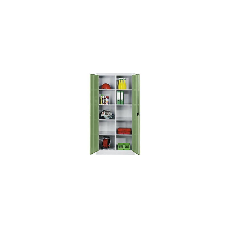 Armadio magazzino in lamiera d'acciaio, 8 ripiani, alt. x largh. x prof. 1950 x 1200 x 500 mm, ante in verde reseda, corpo in grigio chiaro. Fornitura = montato. Altezza = 1950 mm. Larghezza = 1200 mm. Profondità = 500 mm. Struttura = saldata. Portata struttura = 450 kg. Materiale corpo = lamiera d'acciaio. Materiale porta = lamiera d'acciaio. Materiale ripiani = lamiera d'acciaio, zincata. Colore corpo = grigio chiaro RAL 7035. Colore porta = verde reseda RAL 6011. Portata per ripiano = 70 kg. Numero ripiani = 8 pz. Passo di regolazione altezza ripiani = 15 mm. Tipo di porta = anta a battente. Angolo di apertura delle porte = 110 °. Materiale e minuteria in ordine e sotto controllo. Maniglia a conca Ergo-Lock con serratura ergonomica e facile da utilizzare. Grande varietà di colori, su richiesta colori speciali. Struttura in lamiera d'acciaio estremamente robusta. Serratura a cilindro. Ripiani zincati, regolabili in altezza con passo di 15 mm. Vantaggi Ricca dotazione interna e