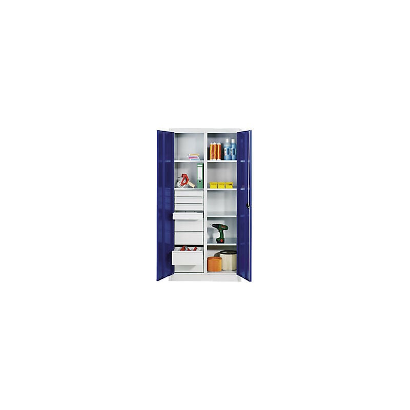 Armadio magazzino in lamiera d'acciaio, 6 ripiani, 8 cassetti, alt. x largh. x prof. 1950 x 1200 x 500 mm, ante in blu genziana, corpo in grigio chiaro. Fornitura = montato. Altezza = 1950 mm. Larghezza = 1200 mm. Profondità = 500 mm. Struttura = saldata. Portata struttura = 450 kg. Materiale corpo = lamiera d'acciaio. Materiale porta = lamiera d'acciaio. Materiale ripiani = lamiera d'acciaio, zincata. Colore corpo = grigio chiaro RAL 7035. Colore porta = blu genziana RAL 5010. Portata per ripiano = 70 kg. Numero ripiani = 6 pz. Passo di regolazione altezza ripiani = 15 mm. Tipo di porta = anta a battente. Angolo di apertura delle porte = 110 °. Materiale e minuteria in ordine e sotto controllo. Maniglia a conca Ergo-Lock con serratura ergonomica e facile da utilizzare. Grande varietà di colori, su richiesta colori speciali. Struttura in lamiera d'acciaio estremamente robusta. Serratura a cilindro. Ripiani zincati, regolabili in altezza con passo di 15 mm. Cassetti con guide di