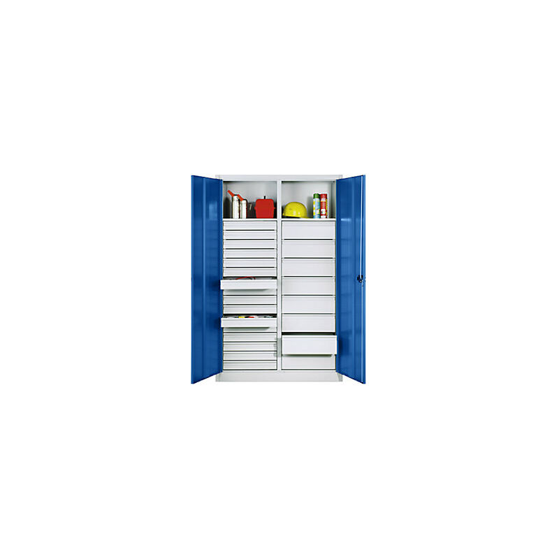 Armadio magazzino in lamiera d'acciaio, 2 ripiani, 24 cassetti, alt. x largh. x prof. 1950 x 930 x 500 mm, ante in blu genziana, corpo in grigio chiaro. Fornitura = montato. Altezza = 1950 mm. Larghezza = 930 mm. Profondità = 500 mm. Struttura = saldata. Portata struttura = 450 kg. Materiale corpo = lamiera d'acciaio. Materiale porta = lamiera d'acciaio. Materiale ripiani = lamiera d'acciaio, zincata. Colore corpo = grigio chiaro RAL 7035. Colore porta = blu genziana RAL 5010. Portata per ripiano = 70 kg. Numero ripiani = 2 pz. Passo di regolazione altezza ripiani = 15 mm. Tipo di porta = anta a battente. Angolo di apertura delle porte = 110 °. Materiale e minuteria in ordine e sotto controllo. Maniglia a conca Ergo-Lock con serratura ergonomica e facile da utilizzare. Grande varietà di colori, su richiesta colori speciali. Struttura in lamiera d'acciaio estremamente robusta. Serratura a cilindro. Ripiani zincati, regolabili in altezza con passo di 15 mm. Cassetti con guide di