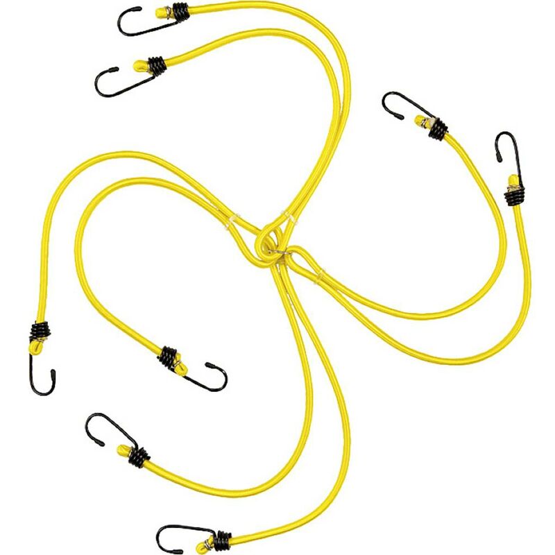 Dettagli tecnici Contenuto 1 pz. Tipo prodotto Ragno elastico Strisce portabagagli, 900 mm Testato TUV/GS, composto da 4 strisce in gomma Dick Ø 8 mm, con 2 Ganci in acciaio con rivestimento in plastica e 2 bracci, robuste strisce portabagagli vengono utilizzate per il fissaggio e il fissaggio di oggetti su biciclette, vani bagagli e carichi sul tetto. Testo tradotto automaticamente