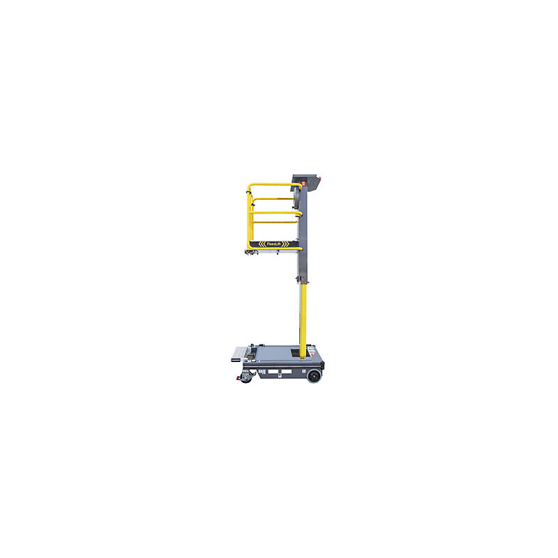 Piattaforma di sollevamento FlexxLift, sollevamento manuale, altezza di lavoro 4,2 m. Fornitura = montato. Altezza di lavoro = 4.2 m. Altezza = 1960 mm. Larghezza = 740 mm. Lunghezza = 1400 mm. Colore = giallo, grigio. Altezza d'ingombro = 1960 mm. Portata max. = 150 kg. Peso = 305 kg. Tipo di prodotto = piattaforme aeree. Numero di persone max. = 1 pz. Lunghezza piattaforma = 850 mm. Larghezza piattaforma = 640 mm. Altezza piattaforma = 2.2 m. Sistema di sollevamento = manuale. Funzionamento senza corrente per impieghi flessibili. Meccanismo di sollevamento manuale continuo con molla a gas. Comando intuitivo con una sola mano per un facile utilizzo. Capacità di carico 150 kg per una persona e gli attrezzi. Dispositivo di frenatura automatica. Robusto e durevole con bassi costi di esercizio. Sali a nuove altezze con FlexxLift MUNK, la piattaforma di sollevamento per lavori di manutenzione senza alimentazione elettrica. Il meccanismo di sollevamento manuale continuo con molla a gas