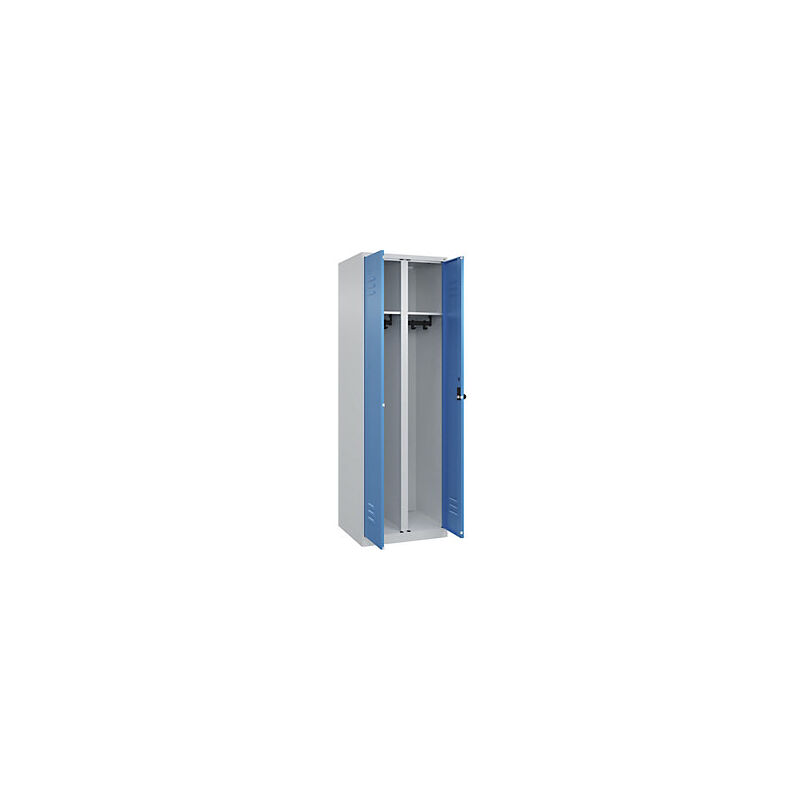 Armadietto bianco e nero Classic PLUS, 1 scomparto, grigio chiaro / blu chiaro, alt. x largh. 1850 x 600 mm, con piedini a pavimento, serratura girevole. Fornitura = montato. Altezza = 1850 mm. Profondità = 500 mm. Larghezza = 600 mm. Colore corpo = grigio chiaro RAL 7035. Colore porta = blu chiaro RAL 5012. Serratura = chiavistello girevole. Numero scomparti in larghezza = 1 pz. Larghezza scomparti = 300 mm. Materiale = acciaio. Dotazione interna = 2 aste appendiabiti con 3 ganci, 2 ripiani. Altezza interna = 1787 mm. Profondità interna = 477 mm. Tipo di porta = anta a battente. Superficie = verniciatura. Frontali con fessure di areazione per una ventilazione ancora più efficace. Profili laterali delle ante chiusi per un'elevata resistenza alla torsione. Ante a battente con serratura unica. Corpo con aperture di ventilazione nella parte superiore e inferiore per una circolazione ottimale dell'aria. Personalizzabili con piedini, zoccolino e piedini a pavimento. Separazione sicura e