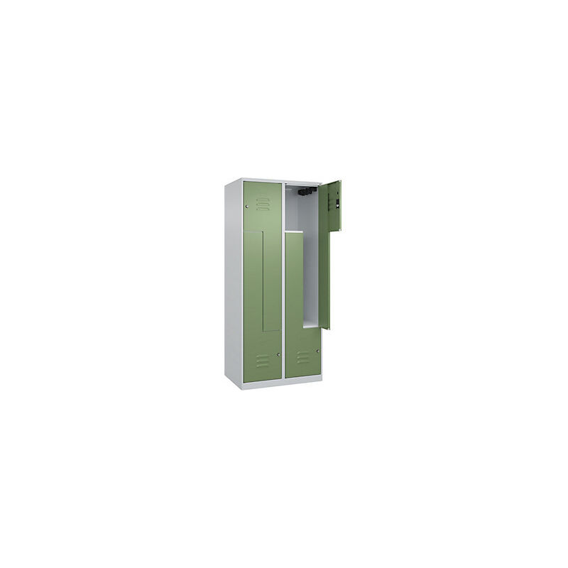 Armadietto a Z Classic PLUS, 2 scomparti, grigio chiaro / verde reseda, largh. 800 mm, con piedini a pavimento, serratura a cilindro. Fornitura = montato. Altezza = 1850 mm. Profondità = 500 mm. Larghezza = 800 mm. Colore corpo = grigio chiaro RAL 7035. Colore porta = verde reseda RAL 6011. Serratura = serratura a cilindro. Numero scomparti in larghezza = 2 pz. Numero scomparti = 4 pz. Larghezza scomparti = 200/400 mm. Materiale = acciaio. Dotazione interna = 1 asta appendiabiti con 4 ganci per scomparto. Altezza interna = 1787 mm. Profondità interna = 477 mm. Numero chiavi = 2 pz. Superficie = verniciatura. Frontali con fessure di areazione per una ventilazione ancora più efficace. Profili laterali delle ante chiusi per un'elevata resistenza alla torsione. Corpo con aperture di ventilazione nella parte superiore e inferiore per una circolazione ottimale dell'aria. Armadietti a forma di Z per appendere capi di abbigliamento lunghi con un ingombro ridotto nella stanza. Personalizzabili