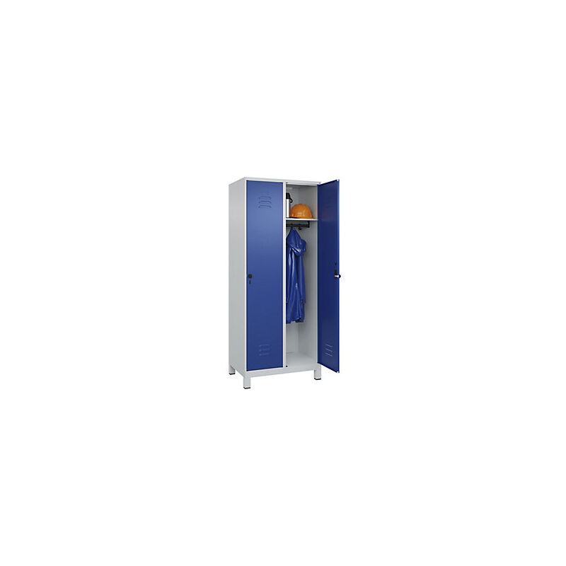 Armadietto Classic PLUS, 2 scomparti, grigio chiaro / blu genziana, largh. 800 mm, con piedini, serratura girevole. Fornitura = montato. Altezza = 1950 mm. Profondità = 500 mm. Larghezza = 800 mm. Colore corpo = grigio chiaro RAL 7035. Colore porta = blu genziana RAL 5010. Serratura = chiavistello girevole. Numero scomparti in larghezza = 2 pz. Larghezza scomparti = 400 mm. Materiale = acciaio. Dotazione interna = 1 asta appendiabiti con 3 ganci e 1 ripiano per scomparto. Altezza interna = 1787 mm. Profondità interna = 477 mm. Tipo di porta = anta a battente. Altezza zoccolo = 100 mm. Superficie = verniciatura. Frontali con fessure di areazione per una ventilazione ancora più efficace. Profili laterali delle ante chiusi per un'elevata resistenza alla torsione. Corpo con aperture di ventilazione nella parte superiore e inferiore per una circolazione ottimale dell'aria. Personalizzabili con piedini, zoccolino e piedini a pavimento. Ideali per l'industria e la produzione, società sportive