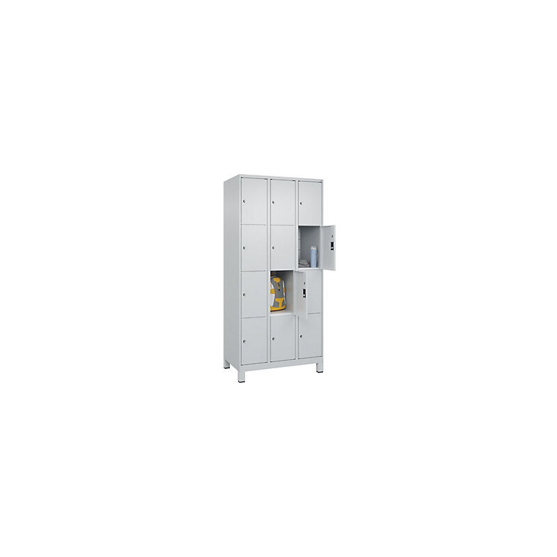 Armadio a scomparti Classic PLUS, 3 scomparti, grigio chiaro, largh. 900 mm, 12 scomparti, con piedini. Fornitura = montato. Altezza = 1950 mm. Profondità = 500 mm. Larghezza = 900 mm. Colore corpo = grigio chiaro RAL 7035. Colore porta = grigio chiaro RAL 7035. Serratura = serratura a cilindro. Numero scomparti in larghezza = 3 pz. Numero scomparti = 12 pz. Larghezza scomparti = 300 mm. Materiale = acciaio. Profondità interna = 477 mm. Tipo di porta = anta a battente. Numero chiavi = 2 pz. Altezza zoccolo = 100 mm. Superficie = verniciatura. Profili laterali delle ante chiusi per un'elevata resistenza alla torsione. Pratici armadi a scomparti per riporre oggetti personali, per maggiore ordine e sicurezza. Personalizzabili con piedini, zoccolino e piedini a pavimento. Ideali per magazzini, officine, società sportive, strutture pubbliche ecc. L'armadio a scomparti Classic PLUS convince per la sua struttura robusta e le sue versatili opzioni di allestimento. L'armadio ha una robusta