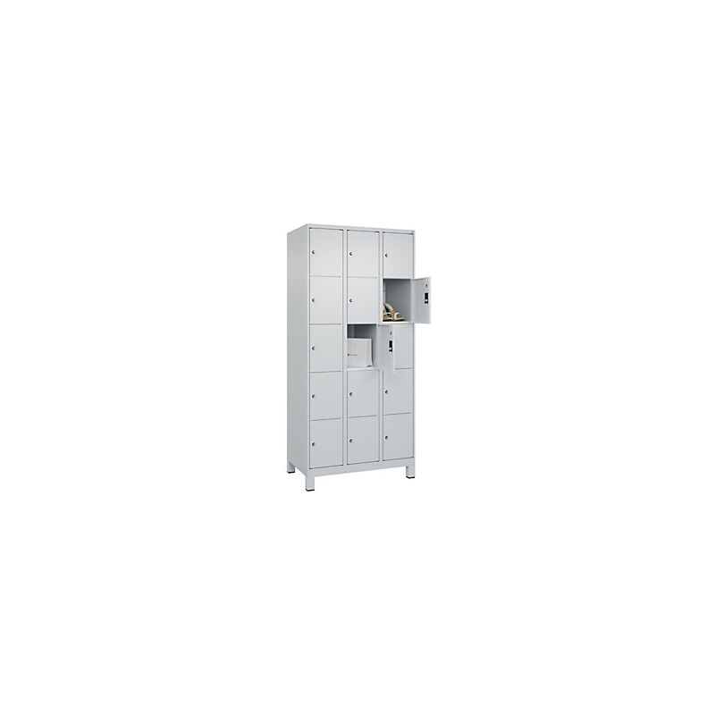 Armadio a scomparti Classic PLUS, 3 scomparti, grigio chiaro, largh. 900 mm, 15 scomparti, con piedini. Fornitura = montato. Altezza = 1950 mm. Profondità = 500 mm. Larghezza = 900 mm. Colore corpo = grigio chiaro RAL 7035. Colore porta = grigio chiaro RAL 7035. Serratura = serratura a cilindro. Numero scomparti in larghezza = 3 pz. Numero scomparti = 15 pz. Larghezza scomparti = 300 mm. Materiale = acciaio. Profondità interna = 477 mm. Tipo di porta = anta a battente. Numero chiavi = 2 pz. Altezza zoccolo = 100 mm. Superficie = verniciatura. Profili laterali delle ante chiusi per un'elevata resistenza alla torsione. Pratici armadi a scomparti per riporre oggetti personali, per maggiore ordine e sicurezza. Personalizzabili con piedini, zoccolino e piedini a pavimento. Ideali per magazzini, officine, società sportive, strutture pubbliche ecc. L'armadio a scomparti Classic PLUS convince per la sua struttura robusta e le sue versatili opzioni di allestimento. L'armadio ha una robusta