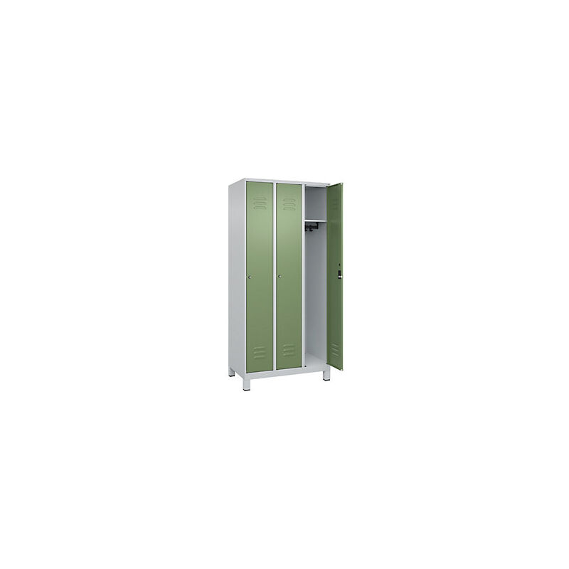 Armadietto Classic PLUS, 3 scomparti, grigio chiaro / verde reseda, largh. 900 mm, con piedini, serratura a cilindro. Fornitura = montato. Altezza = 1950 mm. Profondità = 500 mm. Larghezza = 900 mm. Colore corpo = grigio chiaro RAL 7035. Colore porta = verde reseda RAL 6011. Serratura = serratura a cilindro. Numero scomparti in larghezza = 3 pz. Larghezza scomparti = 300 mm. Materiale = acciaio. Dotazione interna = 1 asta appendiabiti con 3 ganci e 1 ripiano per scomparto. Altezza interna = 1787 mm. Profondità interna = 477 mm. Tipo di porta = anta a battente. Numero chiavi = 2 pz. Altezza zoccolo = 100 mm. Superficie = verniciatura. Frontali con fessure di areazione per una ventilazione ancora più efficace. Profili laterali delle ante chiusi per un'elevata resistenza alla torsione. Corpo con aperture di ventilazione nella parte superiore e inferiore per una circolazione ottimale dell'aria. Personalizzabili con piedini, zoccolino e piedini a pavimento. Ideali per l'industria e la