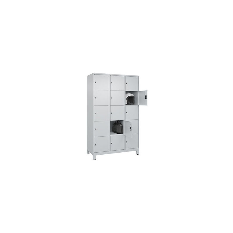 Armadio a scomparti Classic PLUS, 3 scomparti, grigio chiaro, largh. 1200 mm, 15 scomparti, con piedini. Fornitura = montato. Altezza = 1950 mm. Profondità = 500 mm. Larghezza = 1200 mm. Colore corpo = grigio chiaro RAL 7035. Colore porta = grigio chiaro RAL 7035. Serratura = serratura a cilindro. Numero scomparti in larghezza = 3 pz. Numero scomparti = 15 pz. Larghezza scomparti = 400 mm. Materiale = acciaio. Profondità interna = 477 mm. Tipo di porta = anta a battente. Numero chiavi = 2 pz. Altezza zoccolo = 100 mm. Superficie = verniciatura. Profili laterali delle ante chiusi per un'elevata resistenza alla torsione. Pratici armadi a scomparti per riporre oggetti personali, per maggiore ordine e sicurezza. Personalizzabili con piedini, zoccolino e piedini a pavimento. Ideali per magazzini, officine, società sportive, strutture pubbliche ecc. L'armadio a scomparti Classic PLUS convince per la sua struttura robusta e le sue versatili opzioni di allestimento. L'armadio ha una robusta