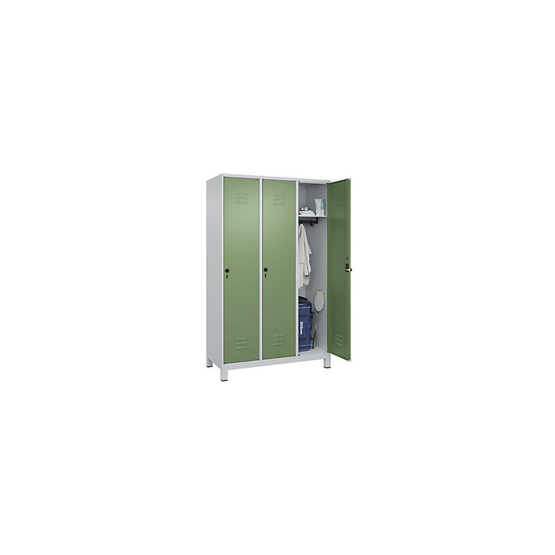 Armadietto Classic PLUS, 3 scomparti, grigio chiaro / verde reseda, largh. 1200 mm, con piedini, serratura girevole. Fornitura = montato. Altezza = 1950 mm. Profondità = 500 mm. Larghezza = 1200 mm. Colore corpo = grigio chiaro RAL 7035. Colore porta = verde reseda RAL 6011. Serratura = chiavistello girevole. Numero scomparti in larghezza = 3 pz. Larghezza scomparti = 400 mm. Materiale = acciaio. Dotazione interna = 1 asta appendiabiti con 3 ganci e 1 ripiano per scomparto. Altezza interna = 1787 mm. Profondità interna = 477 mm. Tipo di porta = anta a battente. Altezza zoccolo = 100 mm. Superficie = verniciatura. Frontali con fessure di areazione per una ventilazione ancora più efficace. Profili laterali delle ante chiusi per un'elevata resistenza alla torsione. Corpo con aperture di ventilazione nella parte superiore e inferiore per una circolazione ottimale dell'aria. Personalizzabili con piedini, zoccolino e piedini a pavimento. Ideali per l'industria e la produzione, società