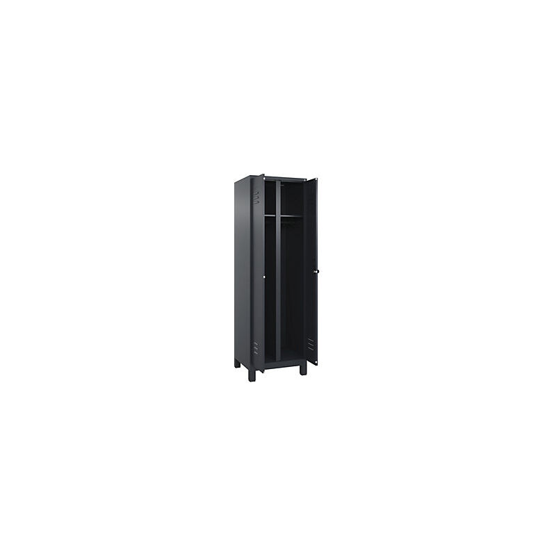 Armadietto bianco e nero Classic PLUS, 1 scomparto, grigio, alt. x largh. 1950 x 600 mm, con piedini, serratura girevole. Fornitura = montato. Altezza = 1950 mm. Profondità = 500 mm. Larghezza = 600 mm. Colore corpo = grigio antracite RAL 7016. Colore porta = grigio antracite RAL 7016. Serratura = chiavistello girevole. Numero scomparti in larghezza = 1 pz. Larghezza scomparti = 300 mm. Materiale = acciaio. Dotazione interna = 2 aste appendiabiti con 3 ganci, 2 ripiani. Altezza interna = 1787 mm. Profondità interna = 477 mm. Tipo di porta = anta a battente. Altezza zoccolo = 100 mm. Superficie = verniciatura. Frontali con fessure di areazione per una ventilazione ancora più efficace. Profili laterali delle ante chiusi per un'elevata resistenza alla torsione. Ante a battente con serratura unica. Corpo con aperture di ventilazione nella parte superiore e inferiore per una circolazione ottimale dell'aria. Personalizzabili con piedini, zoccolino e piedini a pavimento. Separazione sicura e