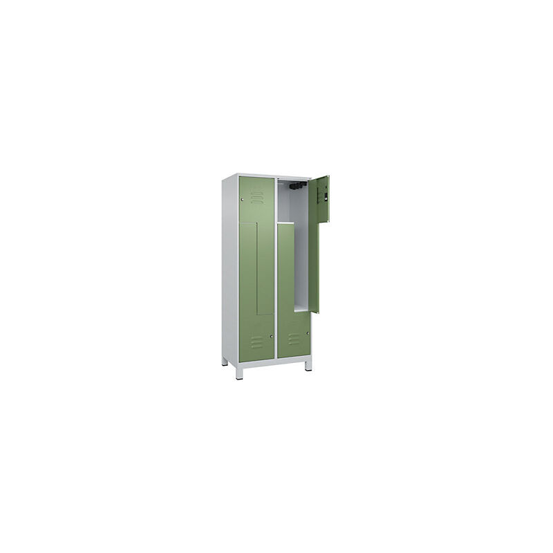 Armadietto a Z Classic PLUS, 2 scomparti, grigio chiaro / verde reseda, largh. 800 mm, con piedini, serratura a cilindro. Fornitura = montato. Altezza = 1950 mm. Profondità = 500 mm. Larghezza = 800 mm. Colore corpo = grigio chiaro RAL 7035. Colore porta = verde reseda RAL 6011. Serratura = serratura a cilindro. Numero scomparti in larghezza = 2 pz. Numero scomparti = 4 pz. Larghezza scomparti = 200/400 mm. Materiale = acciaio. Dotazione interna = 1 asta appendiabiti con 4 ganci per scomparto. Altezza interna = 1787 mm. Profondità interna = 477 mm. Numero chiavi = 2 pz. Altezza zoccolo = 100 mm. Superficie = verniciatura. Frontali con fessure di areazione per una ventilazione ancora più efficace. Profili laterali delle ante chiusi per un'elevata resistenza alla torsione. Corpo con aperture di ventilazione nella parte superiore e inferiore per una circolazione ottimale dell'aria. Armadietti a forma di Z per appendere capi di abbigliamento lunghi con un ingombro ridotto nella stanza.