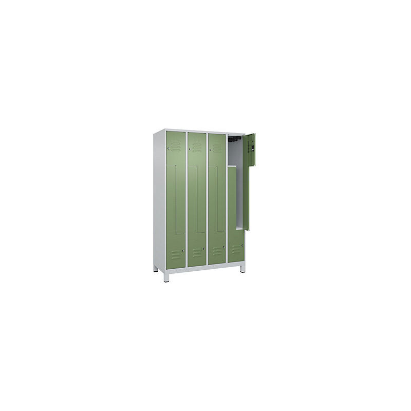 Armadietto a Z Classic PLUS, 4 scomparti, grigio chiaro / verde reseda, largh. 1200 mm, con piedini, serratura a cilindro. Fornitura = montato. Altezza = 1950 mm. Profondità = 500 mm. Larghezza = 1200 mm. Colore corpo = grigio chiaro RAL 7035. Colore porta = verde reseda RAL 6011. Serratura = serratura a cilindro. Numero scomparti in larghezza = 4 pz. Numero scomparti = 8 pz. Larghezza scomparti = 150/300 mm. Materiale = acciaio. Dotazione interna = 1 asta appendiabiti con 3 ganci per scomparto. Altezza interna = 1787 mm. Profondità interna = 477 mm. Numero chiavi = 2 pz. Altezza zoccolo = 100 mm. Superficie = verniciatura. Frontali con fessure di areazione per una ventilazione ancora più efficace. Profili laterali delle ante chiusi per un'elevata resistenza alla torsione. Corpo con aperture di ventilazione nella parte superiore e inferiore per una circolazione ottimale dell'aria. Armadietti a forma di Z per appendere capi di abbigliamento lunghi con un ingombro ridotto nella stanza.
