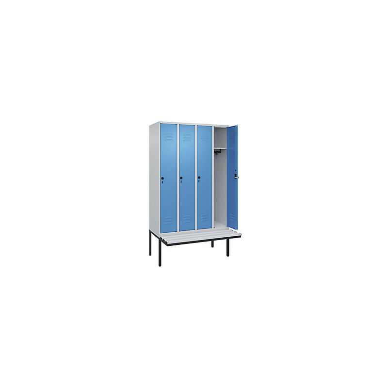 Armadietto Classic PLUS con panca, 4 scomparti, grigio chiaro / blu chiaro, largh. 1200 mm, serratura girevole di sicurezza, panca sporgente, plastica. Fornitura = montato. Altezza = 2120 mm. Larghezza = 1200 mm. Profondità = 815 mm. Colore corpo = grigio chiaro RAL 7035. Colore porta = blu chiaro RAL 5012. Serratura = chiavistello girevole di sicurezza. Numero scomparti in larghezza = 4 pz. Materiale = acciaio. Larghezza scomparti = 300 mm. Dotazione interna = 1 asta appendiabiti con 3 ganci e 1 ripiano per scomparto. Altezza sedile = 450 mm. Profondità sedile = 310 mm. Altezza zoccolo = 420 mm. Altezza armadio = 1175 mm. Versione = con panca. Serie = CLASSIC PLUS. Altezza interna = 1637 mm. Ideali per l'industria e la produzione, società sportive e università. Possibilità di regolazione per la messa in piano su superfici irregolari. Frontali con fessure di areazione per una ventilazione ancora più efficace. Profili laterali delle ante chiusi per un'elevata resistenza alla torsione.