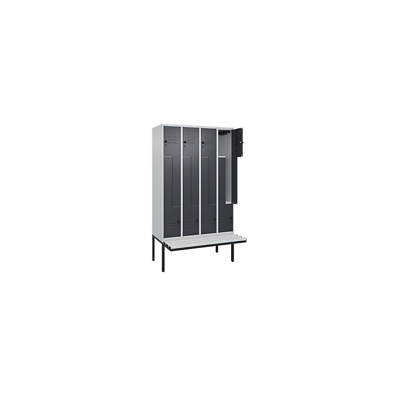 Armadietto a Z Classic PLUS con panca, 4 scomparti, grigio chiaro / grigio, largh. 1200 mm, serratura girevole di sicurezza, panca sporgente, plastica. Fornitura = montato. Altezza = 2120 mm. Larghezza = 1200 mm. Profondità = 815 mm. Colore corpo = grigio chiaro RAL 7035. Colore porta = grigio antracite RAL 7016. Serratura = chiavistello girevole di sicurezza. Numero scomparti in larghezza = 4 pz. Numero scomparti = 8 pz. Materiale = acciaio. Larghezza scomparti = 150/300 mm. Dotazione interna = 1 asta appendiabiti con 3 ganci per scomparto. Altezza sedile = 450 mm. Profondità sedile = 310 mm. Altezza zoccolo = 420 mm. Altezza armadio = 1079 mm. Versione = con panca. Serie = CLASSIC PLUS. Altezza interna = 1637 mm. Possibilità di regolazione per la messa in piano su superfici irregolari. Frontali con fessure di areazione per una ventilazione ancora più efficace. Profili laterali delle ante chiusi per un'elevata resistenza alla torsione. Corpo con aperture di ventilazione nella parte