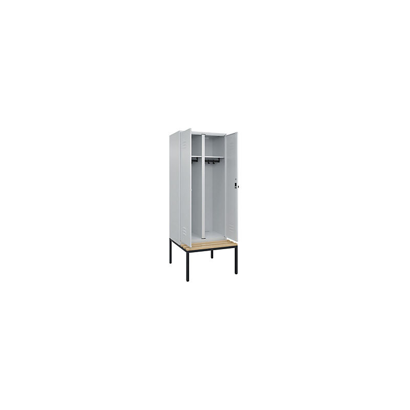 Armadietto bianco e nero Classic PLUS con panca, 1 scomparto, grigio chiaro, largh. 800 mm, serratura girevole di sicurezza, panca integrata, legno duro di faggio. Fornitura = montato. Altezza = 2120 mm. Larghezza = 800 mm. Profondità = 815 mm. Colore corpo = grigio chiaro RAL 7035. Colore porta = grigio chiaro RAL 7035. Serratura = chiavistello girevole di sicurezza. Numero scomparti in larghezza = 1 pz. Materiale = acciaio. Larghezza scomparti = 400 mm. Dotazione interna = 2 aste appendiabiti con 4 ganci, 2 ripiani. Altezza sedile = 450 mm. Profondità sedile = 310 mm. Altezza zoccolo = 420 mm. Altezza armadio = 1175 mm. Versione = con panca integrata. Serie = CLASSIC PLUS. Altezza interna = 1637 mm. Possibilità di regolazione per la messa in piano su superfici irregolari. Frontali con fessure di areazione per una ventilazione ancora più efficace. Profili laterali delle ante chiusi per un'elevata resistenza alla torsione. Ante a battente con serratura unica. Corpo con aperture di