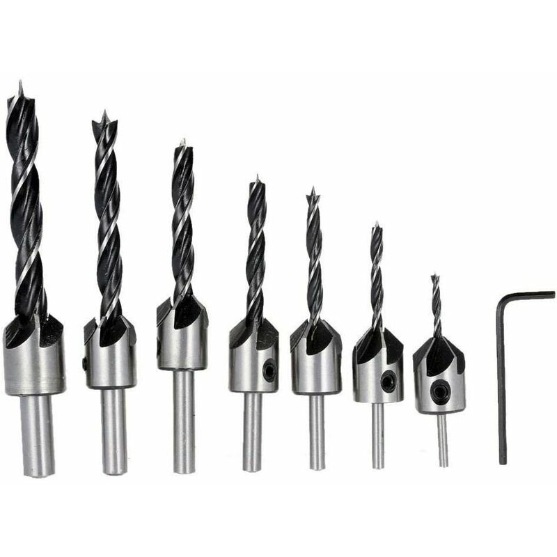 Materiale: punta HSS 4241, punta svasata nera Materiale: acciaio 45, resistente e robusto. Il set di fresatura ha 7 dimensioni: 3mm / 4mm / 5mm / 6mm / 7mm / 8mm / 10mm, in modo da soddisfare perfettamente diverse dimensioni in base alle tue esigenze. La lunghezza di foratura può essere regolata per viti di diversa lunghezza, semplicemente allentando e serrando le aste filettate. Le punte del trapano possono essere facilmente fissate nel trapano o nel trapano a batteria. Lo smusso è a 5 scanalature, che possono scaricare il legno più velocemente durante l'uso, foro del lavandino usa e getta forato liscio, tappo a vite perfettamente integrato nella superficie del pezzo. La lunghezza di foratura può essere regolata per viti di diverse lunghezze semplicemente allentando e serrando le viti di fermo. Adatto per acciaio, alluminio e altri metalli, legno e plastica. 7 pezzi HSS 5 punte per trapano svasatore alesatore per cacciavite punta per trapano per svasatura lavorazione del legno 3-10