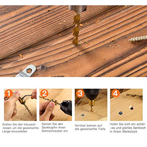 【Valore impostato:】 Il set di trapani include 7 punte da trapano di diverse dimensioni e 1 chiave inglese, le dimensioni sono: 3 mm, 4 mm, 5 mm, 6 mm, 7 mm, 8 mm, 10 mm, il diametro dello smusso è 15,8 mm, che può soddisfare tutte le tue richiesta.