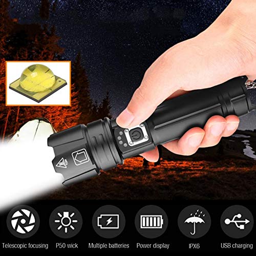 Super luminosa: utilizzando il chip LED XHP70.2 con una durata di 50.000 ore, le potenti torce generano una potenza ultra alta fino a 8000 lumen. Nota: Romove la pellicola trasparente sulla batteria prima di caricarla e utilizzarla, altrimenti la batteria non funzionerà.