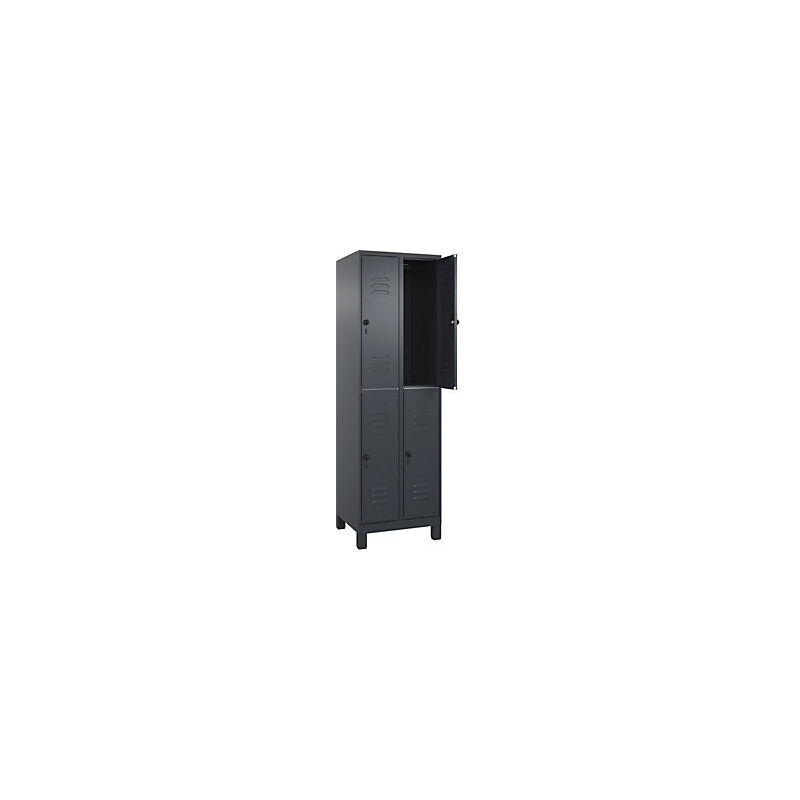 Armadietto a due piani Classic PLUS, 2 scomparti, grigio, alt. x largh. 1950 x 600 mm, con piedini, serratura girevole. Fornitura = montato. Altezza = 1950 mm. Profondità = 500 mm. Larghezza = 600 mm. Colore corpo = grigio antracite RAL 7016. Colore porta = grigio antracite RAL 7016. Serratura = chiavistello girevole. Numero scomparti in larghezza = 2 pz. Numero scomparti = 4 pz. Larghezza scomparti = 300 mm. Materiale = acciaio. Dotazione interna = 1 asta appendiabiti con 3 ganci per scomparto. Altezza interna = 1787 mm. Profondità interna = 477 mm. Tipo di porta = anta a battente. Altezza zoccolo = 100 mm. Superficie = verniciatura. Frontali con fessure di areazione per una ventilazione ancora più efficace. Profili laterali delle ante chiusi per un'elevata resistenza alla torsione. Corpo con aperture di ventilazione nella parte superiore e inferiore per una circolazione ottimale dell'aria. Personalizzabili con piedini, zoccolino e piedini a pavimento. Risparmio di spazio del 50%