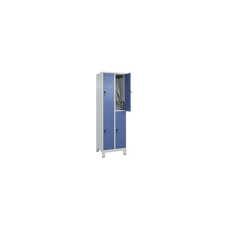 Armadietto a due piani Classic PLUS, 2 scomparti, grigio chiaro / indaco, alt. x largh. 1950 x 600 mm, con piedini, serratura girevole. Fornitura = montato. Altezza = 1950 mm. Profondità = 500 mm. Larghezza = 600 mm. Colore corpo = grigio chiaro RAL 7035. Colore porta = indaco RAL 5023. Serratura = chiavistello girevole. Numero scomparti in larghezza = 2 pz. Numero scomparti = 4 pz. Larghezza scomparti = 300 mm. Materiale = acciaio. Dotazione interna = 1 asta appendiabiti con 3 ganci per scomparto. Altezza interna = 1787 mm. Profondità interna = 477 mm. Tipo di porta = anta a battente. Altezza zoccolo = 100 mm. Superficie = verniciatura. Frontali con fessure di areazione per una ventilazione ancora più efficace. Profili laterali delle ante chiusi per un'elevata resistenza alla torsione. Corpo con aperture di ventilazione nella parte superiore e inferiore per una circolazione ottimale dell'aria. Personalizzabili con piedini, zoccolino e piedini a pavimento. Risparmio di spazio del 50%