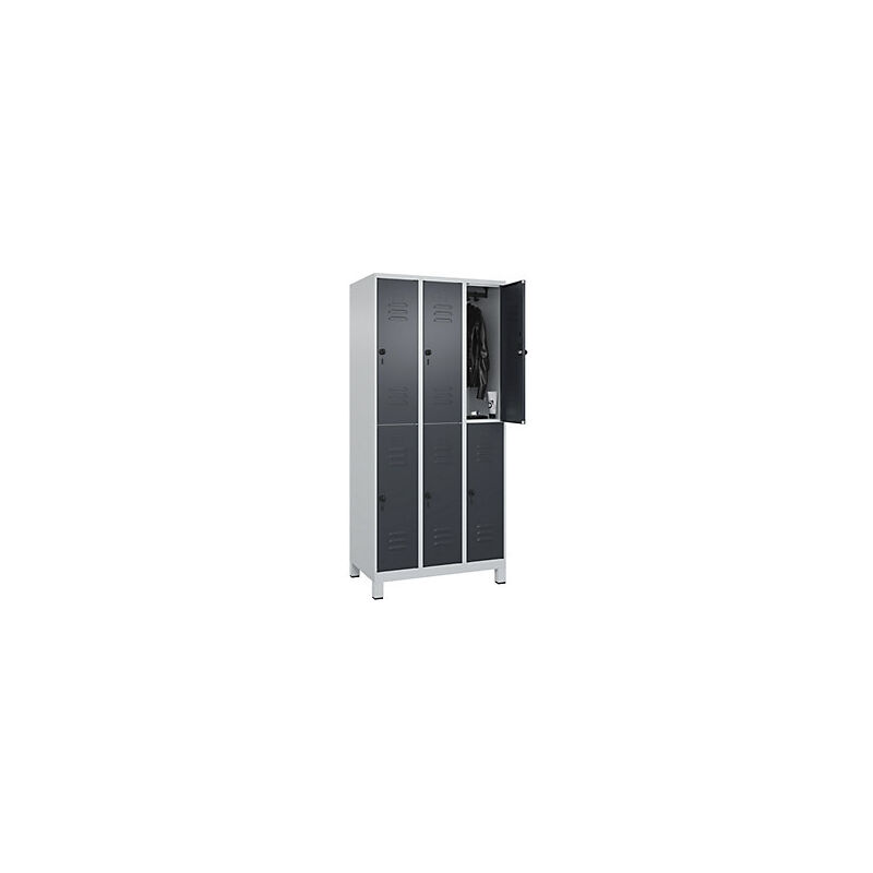 Armadietto a due piani Classic PLUS, 3 scomparti, grigio chiaro / grigio, alt. x largh. 1950 x 900 mm, con piedini, serratura girevole. Fornitura = montato. Altezza = 1950 mm. Profondità = 500 mm. Larghezza = 900 mm. Colore corpo = grigio chiaro RAL 7035. Colore porta = grigio antracite RAL 7016. Serratura = chiavistello girevole. Numero scomparti in larghezza = 3 pz. Numero scomparti = 6 pz. Larghezza scomparti = 300 mm. Materiale = acciaio. Dotazione interna = 1 asta appendiabiti con 3 ganci per scomparto. Altezza interna = 1787 mm. Profondità interna = 477 mm. Tipo di porta = anta a battente. Altezza zoccolo = 100 mm. Superficie = verniciatura. Frontali con fessure di areazione per una ventilazione ancora più efficace. Profili laterali delle ante chiusi per un'elevata resistenza alla torsione. Corpo con aperture di ventilazione nella parte superiore e inferiore per una circolazione ottimale dell'aria. Personalizzabili con piedini, zoccolino e piedini a pavimento. Risparmio di spazio
