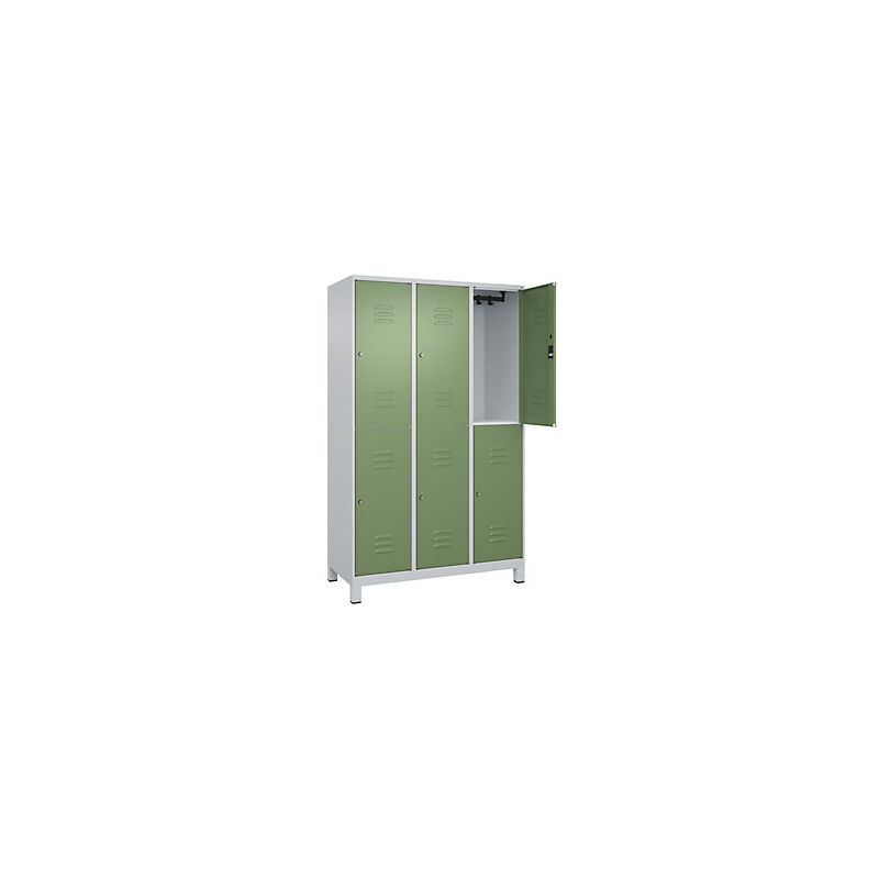 Armadietto a due piani Classic PLUS, 3 scomparti, grigio chiaro / verde reseda, alt. x largh. 1950 x 1200 mm, con piedini, serratura a cilindro. Fornitura = montato. Altezza = 1950 mm. Profondità = 500 mm. Larghezza = 1200 mm. Colore corpo = grigio chiaro RAL 7035. Colore porta = verde reseda RAL 6011. Serratura = serratura a cilindro. Numero scomparti in larghezza = 3 pz. Numero scomparti = 6 pz. Larghezza scomparti = 400 mm. Materiale = acciaio. Dotazione interna = 1 asta appendiabiti con 4 ganci per scomparto. Altezza interna = 1787 mm. Profondità interna = 477 mm. Tipo di porta = anta a battente. Numero chiavi = 2 pz. Altezza zoccolo = 100 mm. Superficie = verniciatura. Frontali con fessure di areazione per una ventilazione ancora più efficace. Profili laterali delle ante chiusi per un'elevata resistenza alla torsione. Corpo con aperture di ventilazione nella parte superiore e inferiore per una circolazione ottimale dell'aria. Personalizzabili con piedini, zoccolino e piedini a